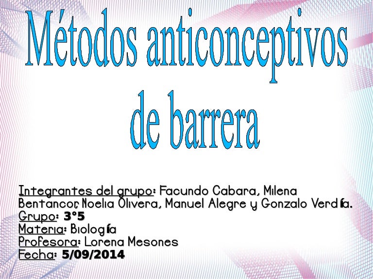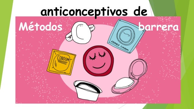 Los anticonceptivos de barrera incluyen espermicidas vaginales espumas cremas óvulos condones diafragmas capuchones cervicales y esponjas anticonceptivas. Uso de mØtodos de barrera que eviten el contacto directo de la mucosa bucal con flui-dos que son potencialmente infecciosos para el VIH y otras ITS. Es importante para no disminuir la seguridad del método que sea colocado antes de la penetración en vagina si se lo coloca sólo para el momento de la eyaculación aumentan los riesgos de embarazo ya que pueden salir espermatozoides antes de la eyaculación y fecundar. Algunos preservativos contienen espermicidas. Actúan como barreras físicas ya que no permiten que los espermatozoides pasen. Es una funda que puede ser de poliuretano nitrilo látex natural polietileno o silicona. Algunos métodos de barrera también proporcionan protección contra algunas enfermedades de transmisión sexual ETS incluyendo la clamidia y el VIH y detienen el paso de estas infecciones de una pareja sexual a otra. Este tipo de método anticonceptivo es tan común que los consigues en algunos casos fácilmente en una tienda o farmacia. Métodos de Barrera.