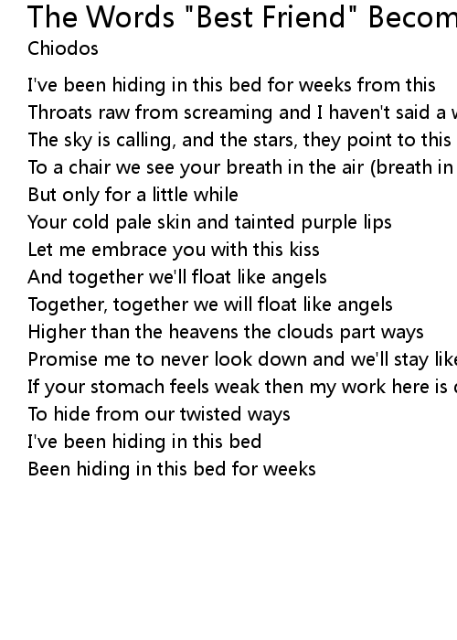 Chiodos - The Words Best Friend Become Redefined Lyrics Ive been hiding in this bed for weeks from this Throats raw from screaming and I havent said. KPOP LYRICS LIST. Chiodos The Word best Friend Becomes Redefined Lyrics. The Words Best Friend Become Redefined Lyrics. Learn the full song lyrics at MetroLyrics. General CommentThis is just my interpretation. Get the album here.