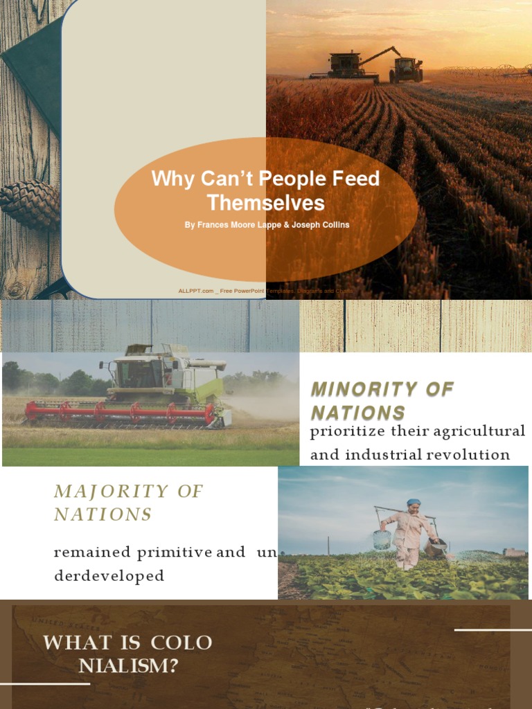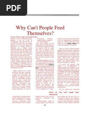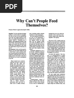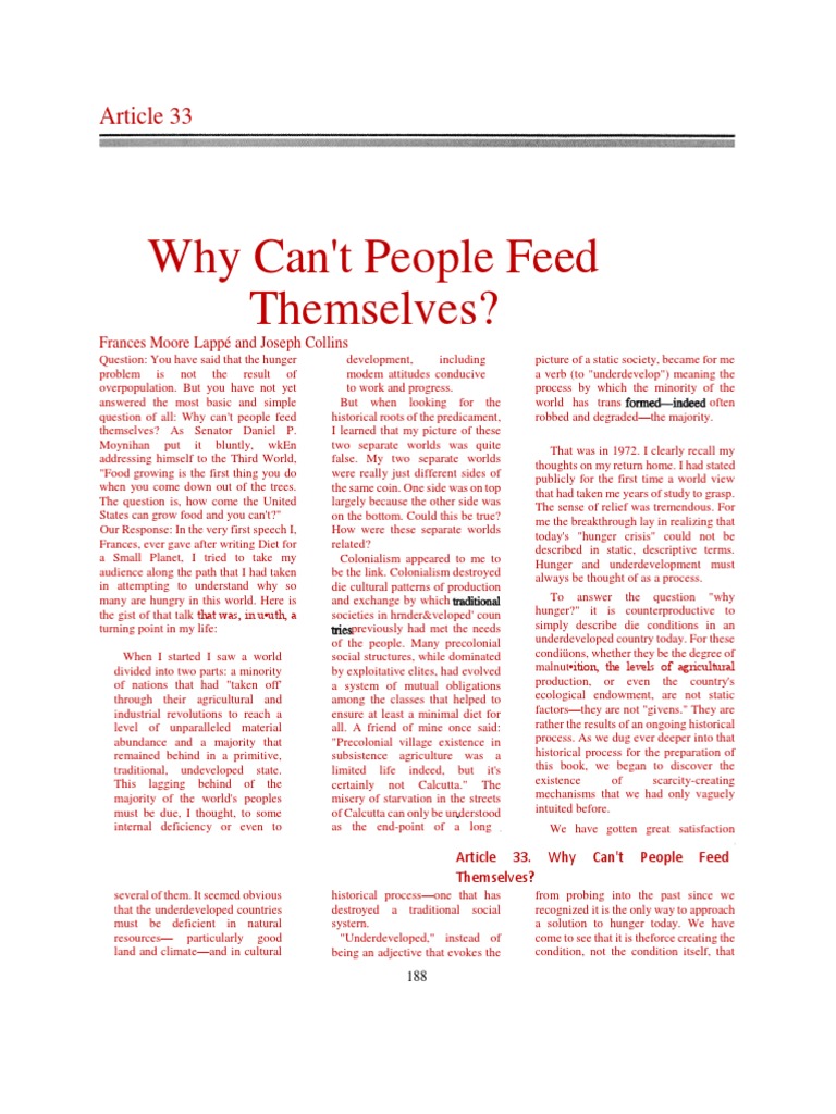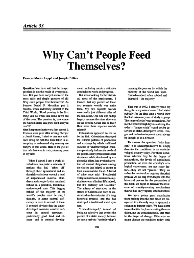 In their seminal interview Moore Lappe and Collins 1977 focus on why most of the planet goes hungry. Advantage of considerable power sought their own self-interest often arrogantly believing they were acting in the interest of the people whose lives they were destroying. Based on the essay Why cant people feed themselves by Frances Moore Lappe and Joseph Collins it looks at the development of inequality between peoples and nations from the time of the colonial period to the present linking economic capacity and poverty to political and economic power.